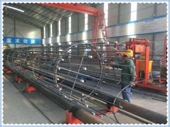 1)鋼筋籠的制作工藝流程 鋼筋下料→根據鋼筋籠配料單分別加工標準螺紋絲頭和標準長(cháng)螺紋絲頭→在鋼筋籠制作工裝上制作鋼筋籠(應確保二節或多節鋼筋籠對接處的下一節鋼筋籠中的鋼筋絲頭均為長(cháng)絲)→將需要和第一節連接的第二節鋼筋籠的鋼筋用標準絲扣型套筒連接到第一節鋼筋籠上→用環(huán)形箍筋焊接第二節鋼筋籠→在某一接頭對接處標上明顯的配合標記→將對接好的鋼筋籠從對接處拆開(kāi)→將鋼筋籠放在鋼筋加工場(chǎng)地內或運到施工樁基處等待連接。