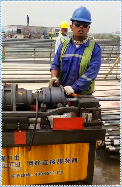 1) 對現場(chǎng)的操作人員必須進(jìn)行崗前培訓和技能考核,考核合格后方可持上崗證。操作杜絕不規范及違規操作。2) 鋼筋加工絲頭端面必須平直,盡量采用砂輪削割機或者無(wú)齒鋸下料,對端面彎曲、馬蹄嚴重的應切削,以免影響絲頭質(zhì)量。3) 進(jìn)行鋼筋滾軋螺紋加工時(shí),經(jīng)常添加水溶性切割潤滑液,當氣溫低于 0 ℃ 時(shí),應摻入 15% ~20% 亞硝酸鈉。不得使用油性切削液剝肋,嚴禁不加切削液加工絲頭。4) 待加工鋼筋必須系好標識牌,避免加工后對錯型號。5) 絲頭加工檢驗完成后其端頭應及時(shí)加戴好保護帽,防止絲頭在搬運和安裝施工過(guò)程中被損壞或被水泥漿污染。6)絲頭加工過(guò)程中應經(jīng)常檢查絲牙長(cháng)度、絲牙牙型的飽滿(mǎn)度及完整絲扣圈數。